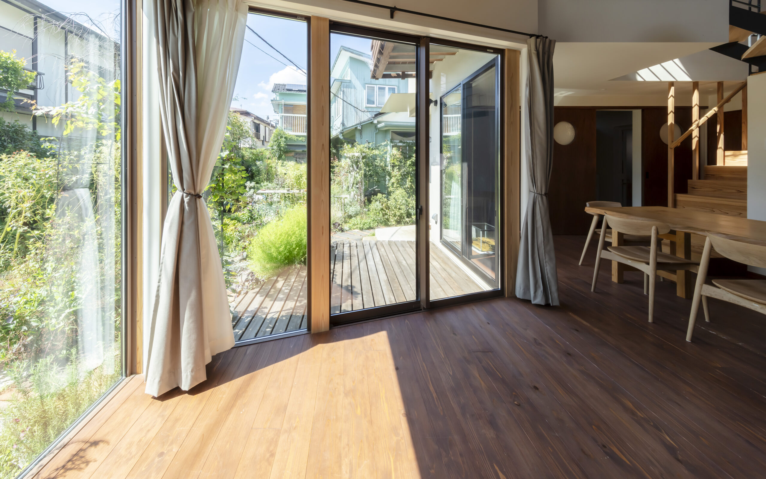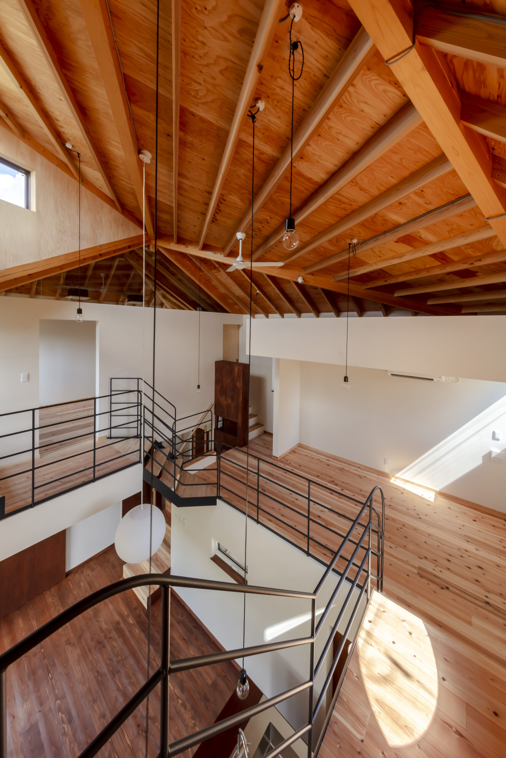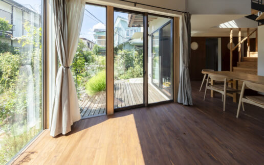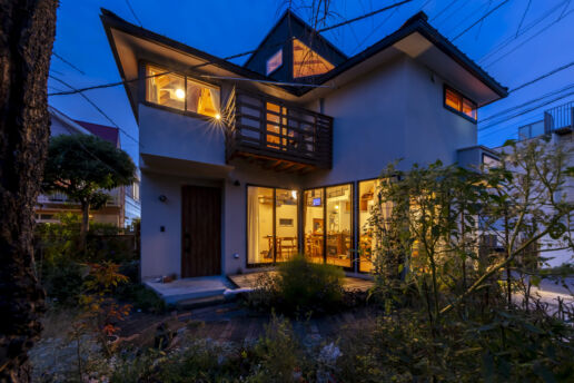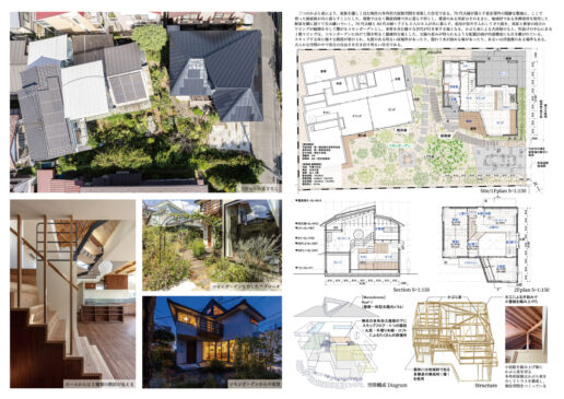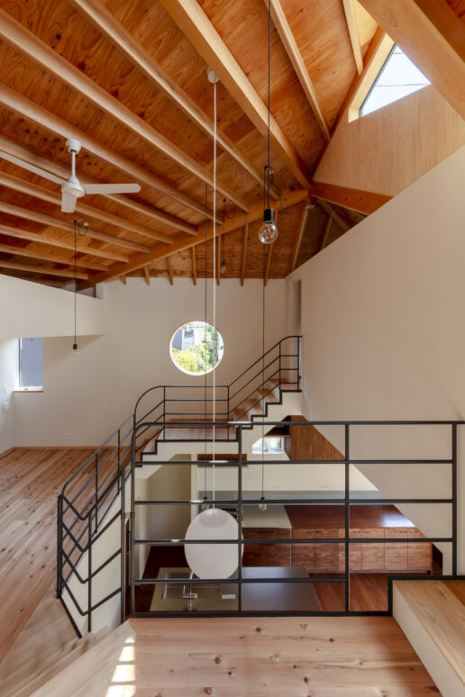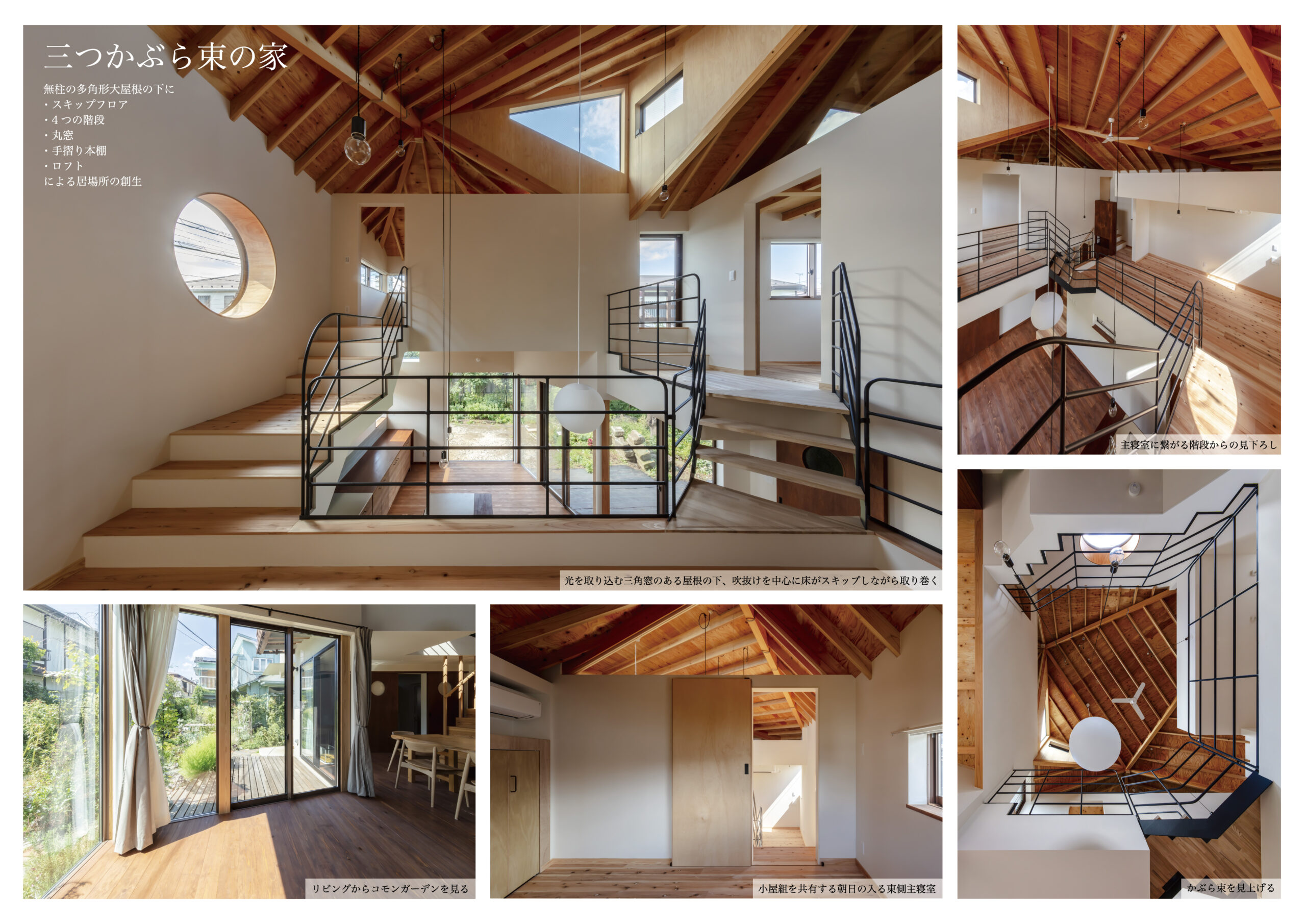 三つのかぶら束により、家族を優しく包む無柱の多角形大屋根空間を実現した住宅である。70代夫婦が暮らす東京郊外の閑静な敷地に、ここで育った娘家族が共に暮らすことにした。増築ではなく隣接別棟で共に暮らす形とし、愛着のある実家はそのままに、地域材である多摩産材を使用した新家を隣に建てて住み継いでいく。祖母が長年手入れしてきた庭を、実家と新家の両方のリビングが縁側を介して繋がるコモンガーデンとし、来客を含む様々な世代が行き来する場となる。かぶら束による大屋根のもと、吹抜けの中心にある1階リビングは、コモンガーデンに向けて開き明るく健康的な場とした。太陽の恵みが得られるような配置計画が内部構成にも引き継がれている。スキップする床に様々な階段が架けられ、丸窓のある明るい居場所があったり、隠れて本が読める場があったり、あるいは浮遊感のある場所もある。大らかな空間の中で各自の自由さを引き出す明るい住宅である。